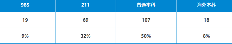 其中,本科院校背景来自985院校的同学共计19枚;211院校的同学共计69枚;普通本科共计107枚;海外本科18枚。