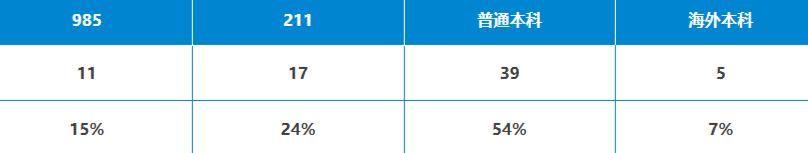 其中,本科院校背景来自985院校的同学共计11枚;211院校的同学共计17枚;普通本科共计39枚;海外本科5枚。