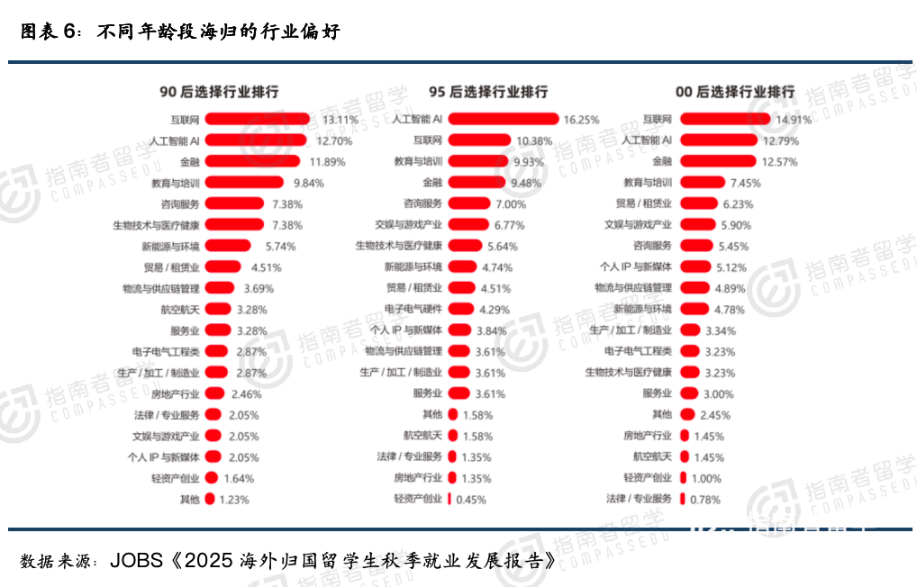 深圳市海归协会与JOBS招聘平台联合发布的报告显示,各年龄段海归里,想进互联网和AI领域的合计占比超25%;尤其是“95后”海归,对AI的偏好度高达16.25%,妥妥的“AI追星族”。