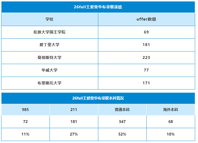 截至目前,在最新的26fall申请中,指南者留学共计收获668枚王爱曼华布offer。其中,伦敦大学国王学院69枚;爱丁堡大学128枚;曼彻斯特大学223枚;华威大学77枚;布里斯托大学171枚;