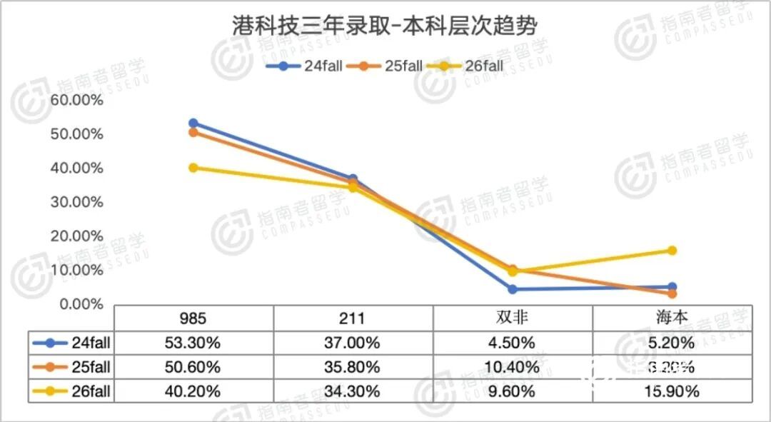 数据也能看出来:港科的双非生源占比从25fall的4.5%涨到26fall的9.6%实现翻倍,海本占比更是翻倍增长达到了15.9%,其中33%的海本生源来自港五院校,无疑都是奔着港科强势专业来的。