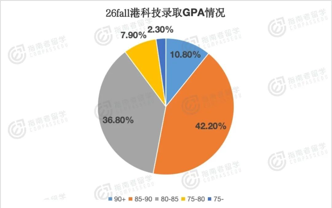 但港科85-90分段占42.20%,80-85分段也有36.80%,甚至75-80分段占7.90%,可见港科更接受“中上GPA+特色背景”的申请者。