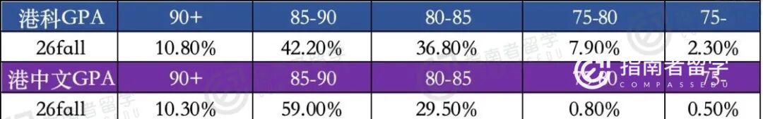 再看和老对手港中文的申录对比,港中文26fall录取中,85-90分段的GPA占比高达59%,75-80分段仅0.80%,坚持贯彻“卡高分”标准。