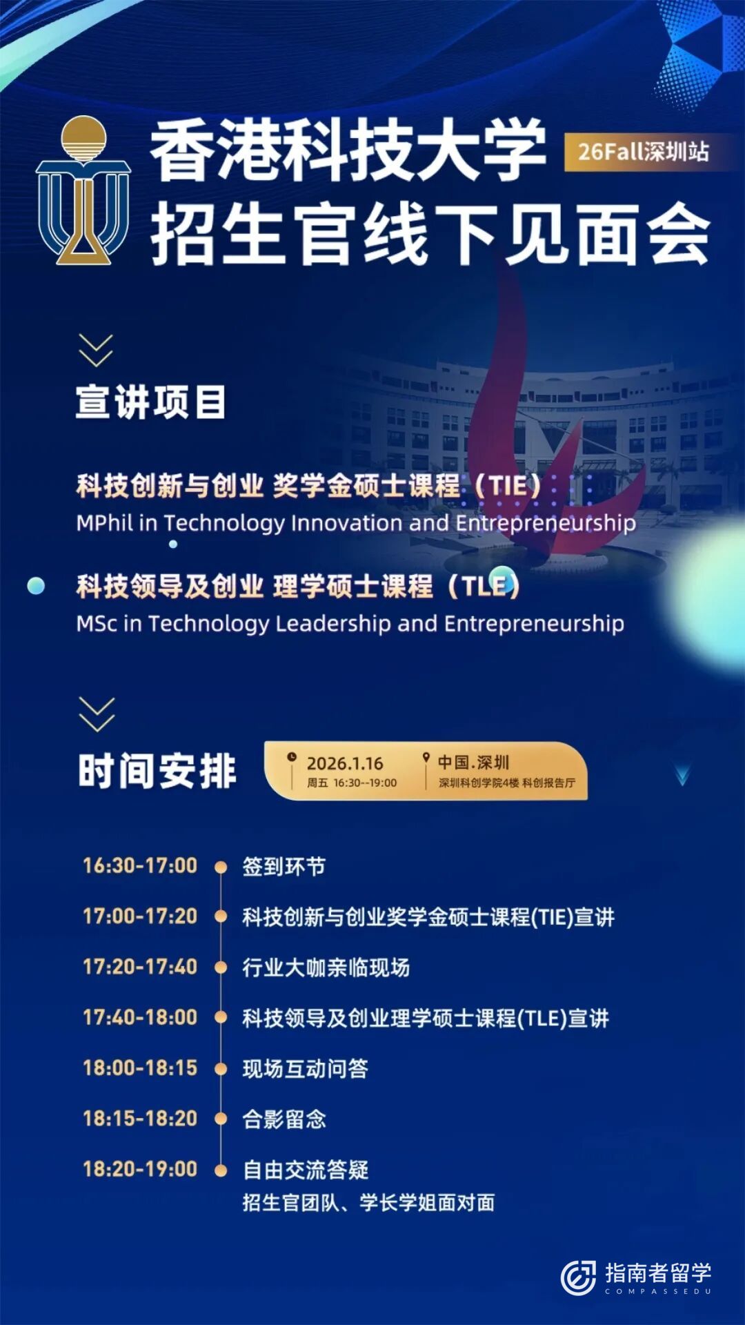 1月16日(周五)16:30-19:00,在深圳科创学院,由港科综合系统与设计学部(ISD)主办,深圳科创学院、指南者留学协办!