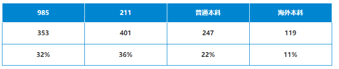 其中,来自985院校的353枚;211院校401枚;普通本科247枚;海外本科119枚。