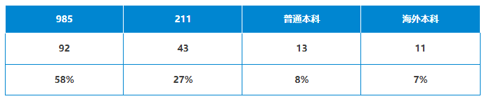 其中,来自985院校的92枚;211院校43枚;普通本科13枚;海外本科11枚。