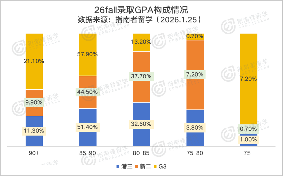 G3对高分的执念最深,低于80分的申请者录取占比不足8%,90分以上的高分群体占比超两成。高分几乎是申请G3的核心“敲门砖”,尤其是热门专业,GPA的短板很难用其他背景弥补。