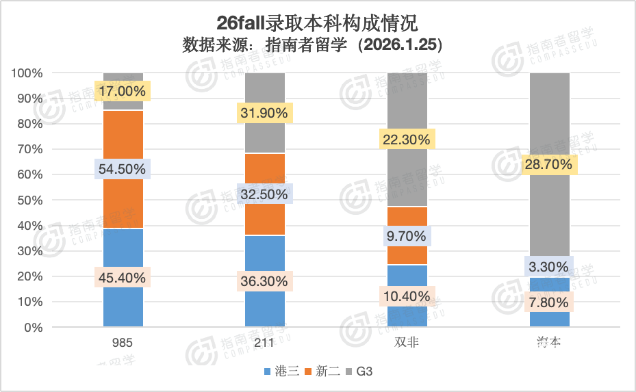 此外就是中外合办和海本背景的同学,在G3院校的录取中优势也格外突出,录取占比高达28.7%,远高于港三、新二的录取占比。