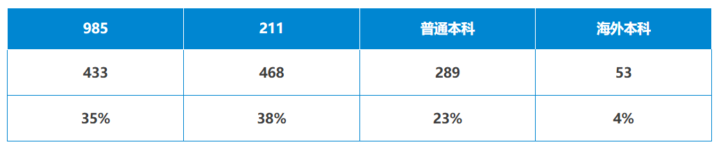 其中,来自985院校的433枚;211院校468枚;普通本科289枚;海外本科53枚。