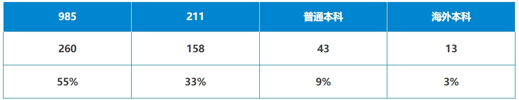 其中,来自985院校的260枚;211院校158枚;普通本科43枚;海外本科13枚。