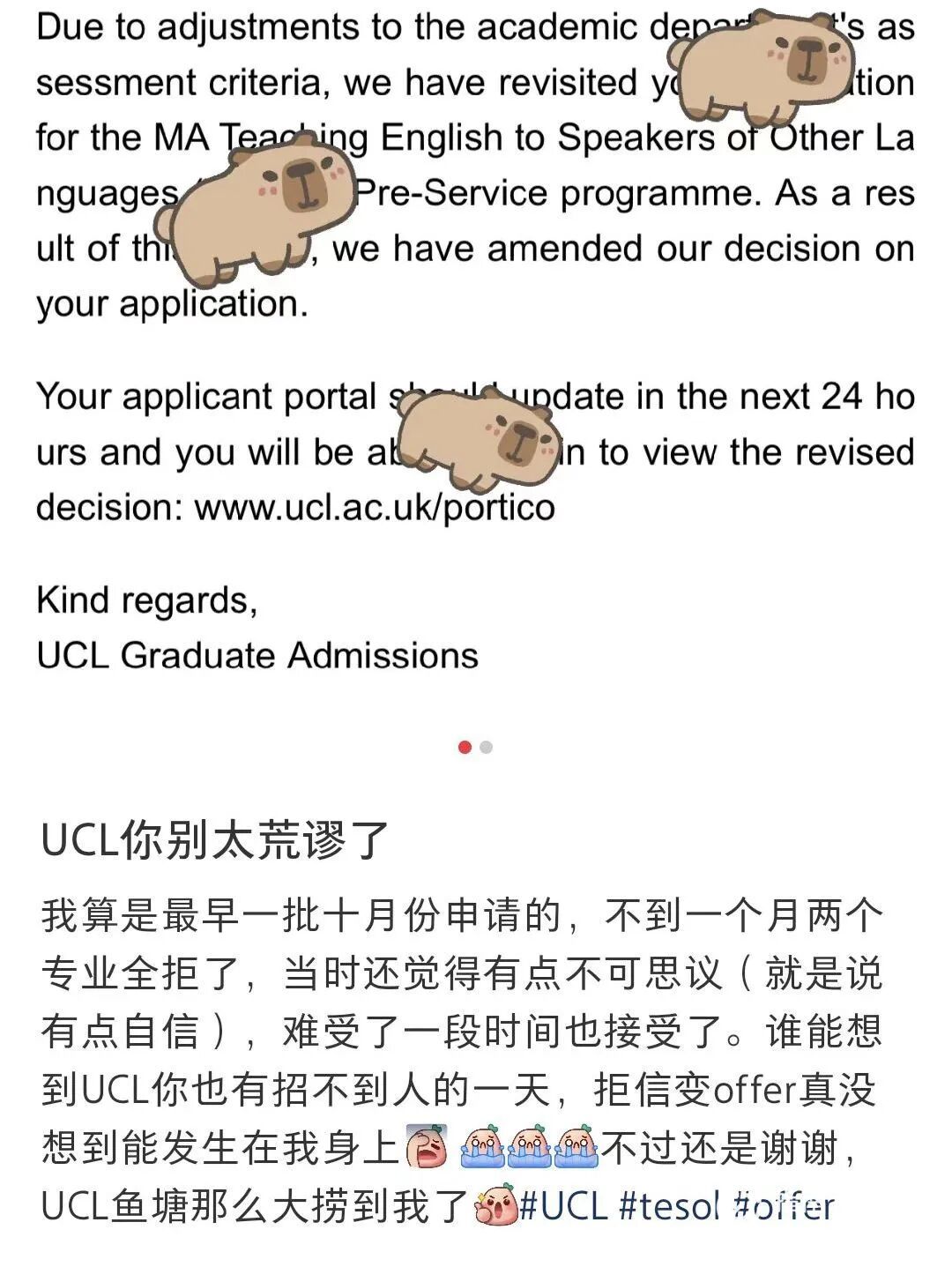 有位同学晒出了UCL的“复活邮件”,明明11月申请的时候被秒拒,隔了几个月居然被招生官从拒信池里“捞回来”补录,拒信直接换成offer!