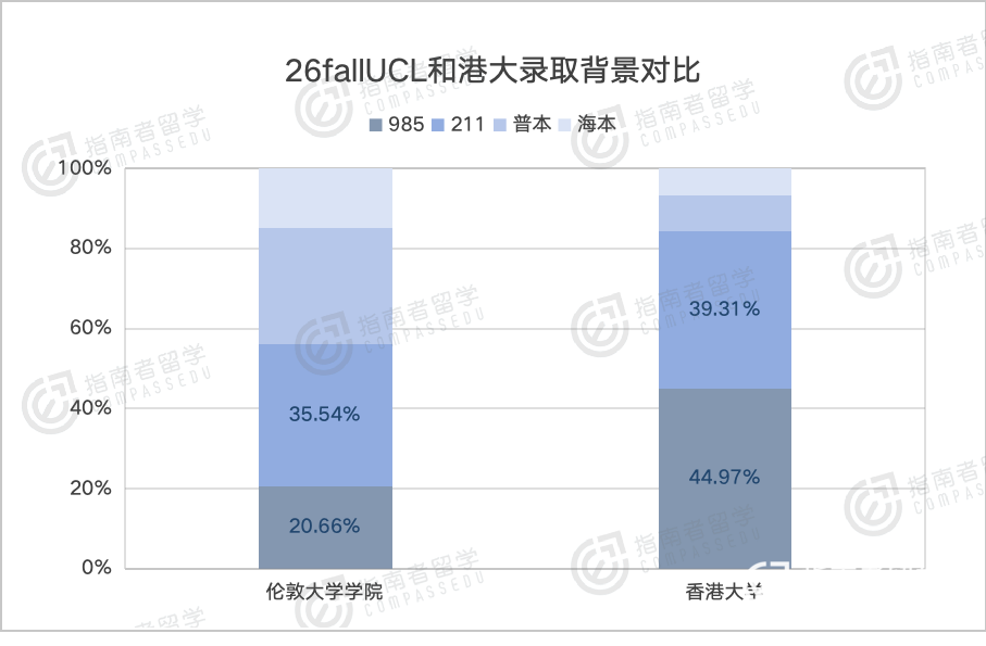 再看院校背景,UCL反而比港大更包容。港大985占比要将近45%,而UCL只有20.66%,连港大的一半都没到。