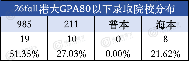 37位录取者中,985背景的学生有19位,占比51.35%,211背景10位,占比27.03%,两者合计近八成。这表明,尽管GPA未达传统要求,但顶尖本科的平台认可度起到了关键的支撑作用。