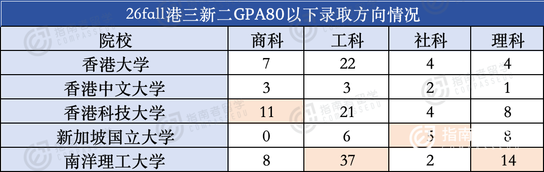 理科则要看学校“下菜”——新国立和南洋理工的理科对低均分学生更友好,尤其是南洋理工,而港校的理科名额相对较少。如果你是理科背景,均分不到80,可以重点关注新加坡的两所学校,成功概率会更高。