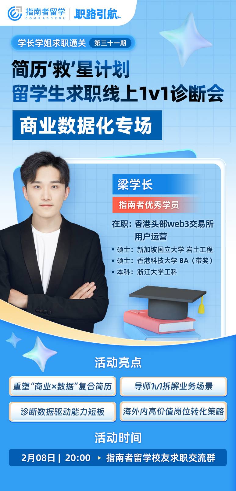 本次“简历救星”简历优化专场,特邀拥有浙江大学、NUS及香港科技大学背景,现任香港Web3交易所运营的梁学长现场辅导。聚焦“商业×数据”方向,深度分享复合简历重塑、业务场景拆解、数据能力诊断及海内外岗位转化策略,助力正在准备春招和实习留学生精准提升求职竞争力。尤为重磅的是,本次活动为指南者学员开放限量免费名额,可享受导师一对一的现场简历深度诊断机会,是提升求职竞争力的绝佳平台。