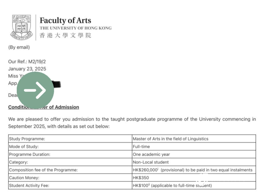 在指南者老师的指导下,我给港大发了一封礼貌的询问邮件。没想到,学校很快回复,承诺两周内给出正式推研信。两周后,我顺利拿到了港大语言学的conditional offer。