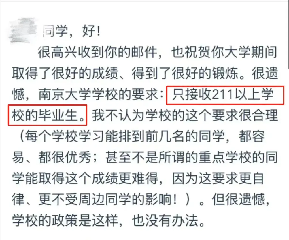 之前,南京大学某学院在入营咨询邮件中有回复:“学校要求只接收211以上学校的毕业生”。