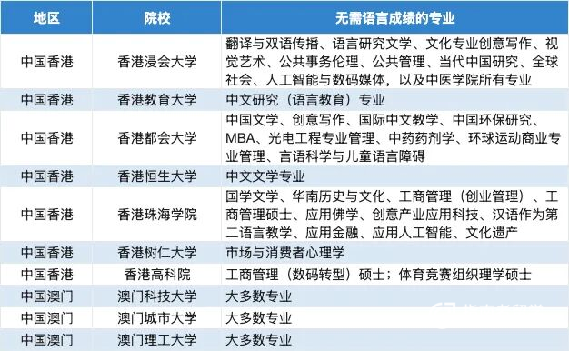 香港都会大学的中国文学、创意写作、国际中文教学、中国环保研究等专业,也采用中文教学,无需语言成绩。
