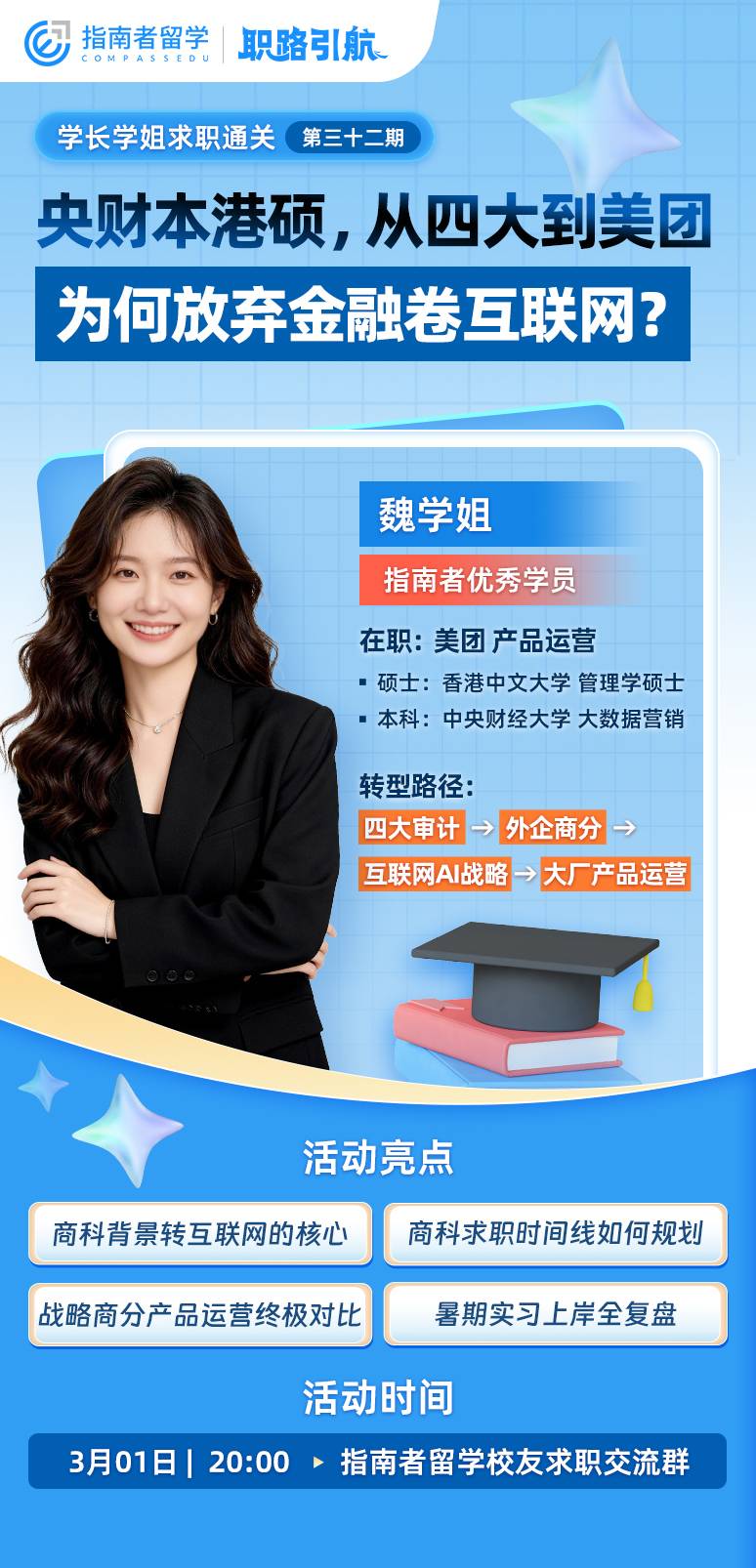 指南者校友求职第32期分享会!央财大数据营销、港中文管理学硕士魏学姐开讲。从四大审计、外企商分到互联网AI战略,最终入职美团产品运营。她将剖析商科生转战互联网的核心竞争力,详解求职时间线,对比战略/商分/产品运营岗位差异,复盘暑期实习全流程,助你拿下心仪Offer!