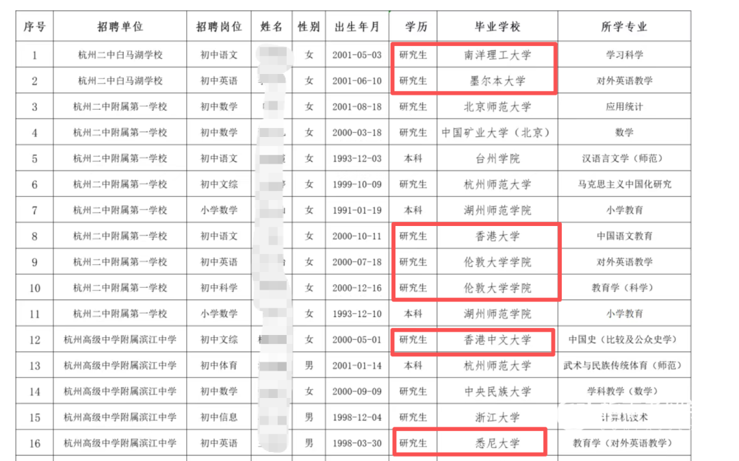 指南君特意扒了杭州滨江区教育局的2024年的招聘公示,拟录取的59名编制教师里,留学生占了20%,其中港大、南洋理工的研究生扎堆入选。