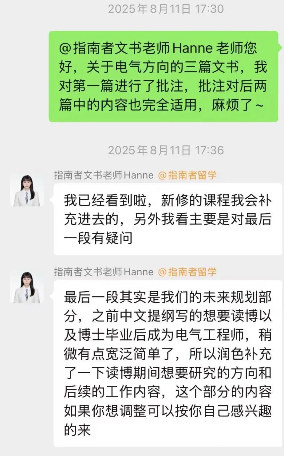 但指南者的文书老师不一样,文书逻辑顺、语言也流畅,既突出了我的优势,还把我的“新能源”背景和申请的“电气”方向巧妙结合起来,形成了独一无二的个人故事线。