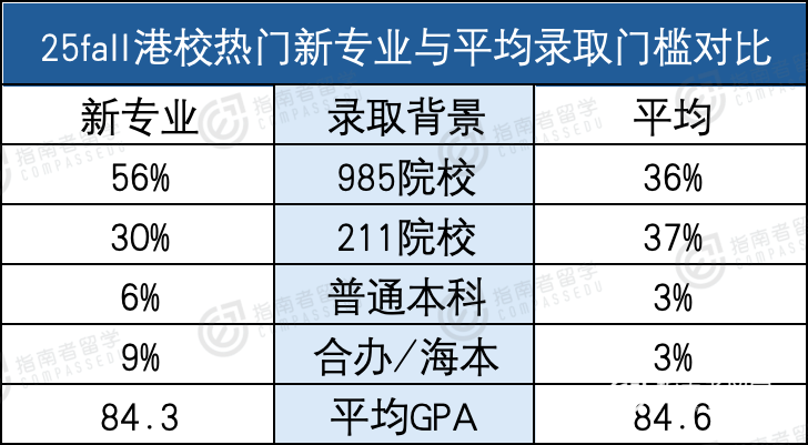 从25fall港校热门新专业与平均录取门槛的对比数据来看,新专业普通本科和海本的录取占比更高,平均GPA要求也更低。