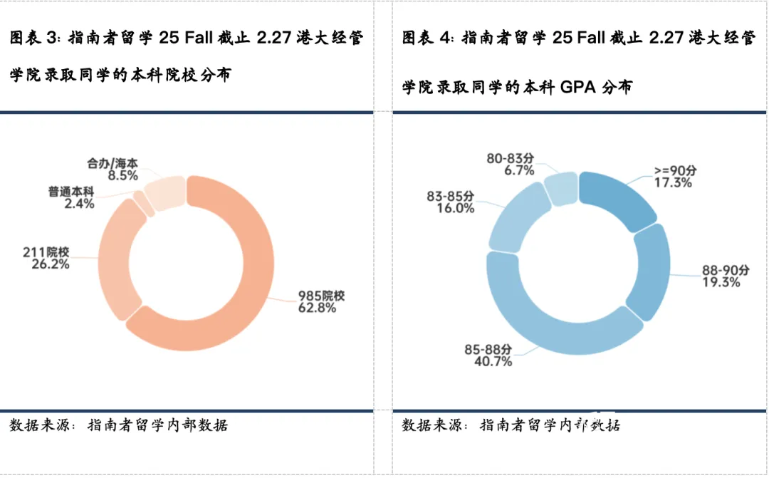 从指南者25Fall数据看,港大经管院近63%的录取来自985,GPA85以下基本没戏;而26Fall至今,名校生占比更是高达80%。