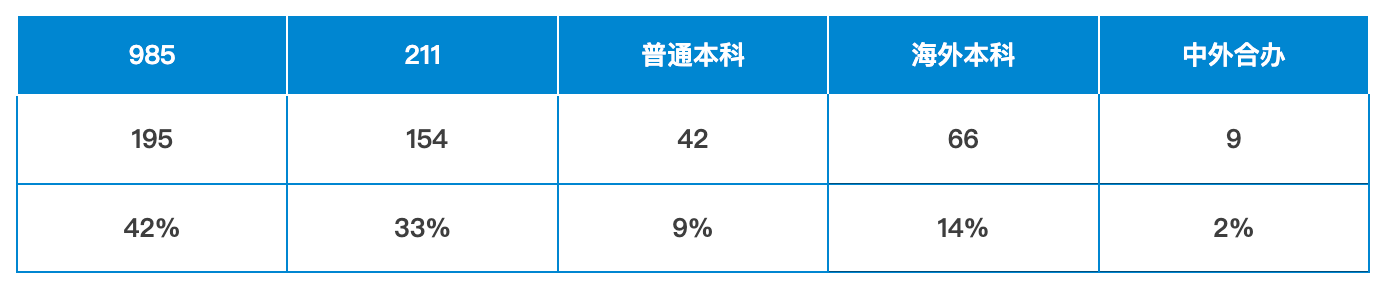 其中,本科院校背景来自985院校的共计195枚;来自211院校的共计154枚;来自普通本科的共计42枚;来自海外本科的共计66枚;来自中外合办的共计9枚。