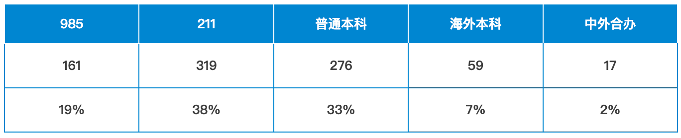 其中,本科院校背景来自985院校的共计161枚;来自211院校的共计319枚;来自普通本科的共计276枚;来自海外本科的共计59枚;来自中外合办的共计17枚。