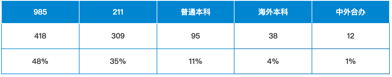 其中,本科院校背景来自985院校的共计418枚;来自211院校的共计309枚;来自普通本科的共计95枚;来自海外本科的共计38枚;来自中外合办的共计12枚。