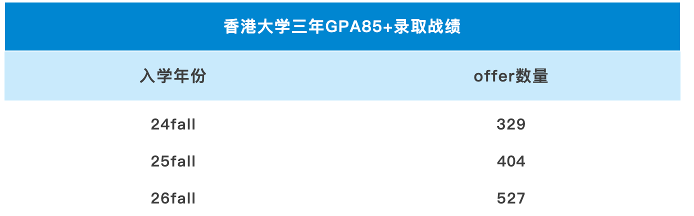 指南君第一时间整理了近三年的录取案例,截至数据统计时(2026年3月31日),在24fall中,指南者留学共计收获329枚香港大学GPA85+offer;在25fall中,指南者留学共计收获404枚香港大学GPA85+offer;在26fall中,指南者留学共计收获527枚香港大学GPA85+offer。