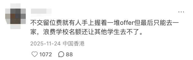 更让人破防的是,由于各个学校发Offer的时间差,“交完保底校留位费,转头梦校Offer就来”的惨剧,正在每个申请季反复上演。