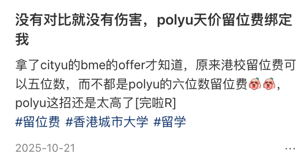 前几天看到一位同学发帖吐槽:前一秒刚收到香港理工大学的Offer,还没来得及欢呼,点开附件里的缴费单一看,笑容当场凝固在脸上。