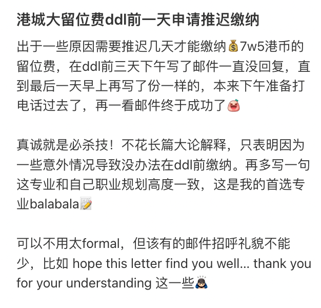 不要看到短短的ddl就认命!收到offer后,如果DDL实在太紧,而梦校还未有消息,第一时间写邮件向发放offer的学校申请延期支付留位费。这是最常规且有效的操作。