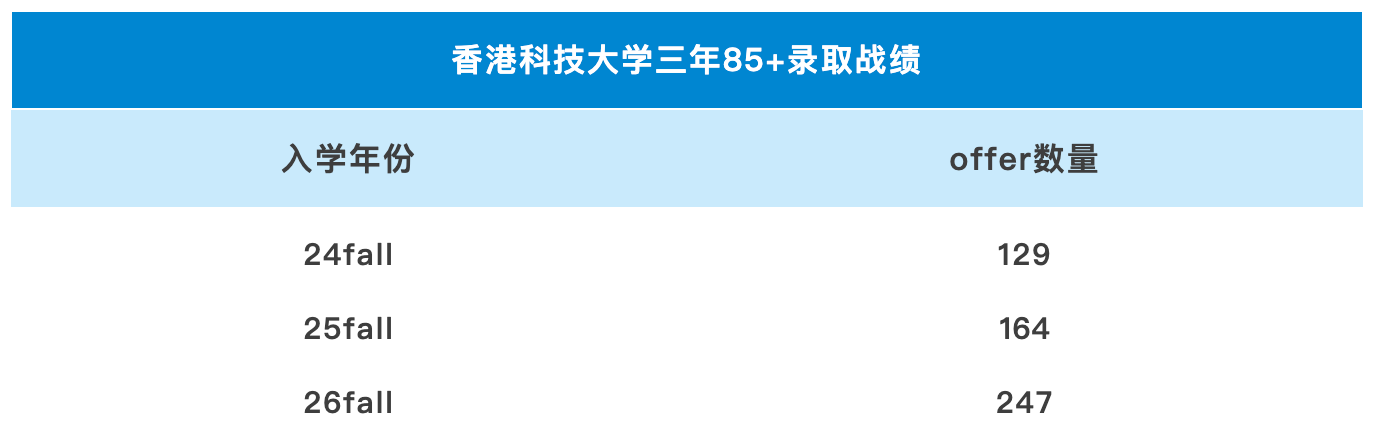 指南君第一时间整理了近三年的录取案例,截至数据统计时(2026年3月31日),在24fall中,指南者留学共计收获129枚香港科技大学GPA85+offer;在25fall中,指南者留学共计收获164枚香港科技大学GPA85+offer;在26fall中,指南者留学共计收获247枚香港科技大学GPA85+offer。