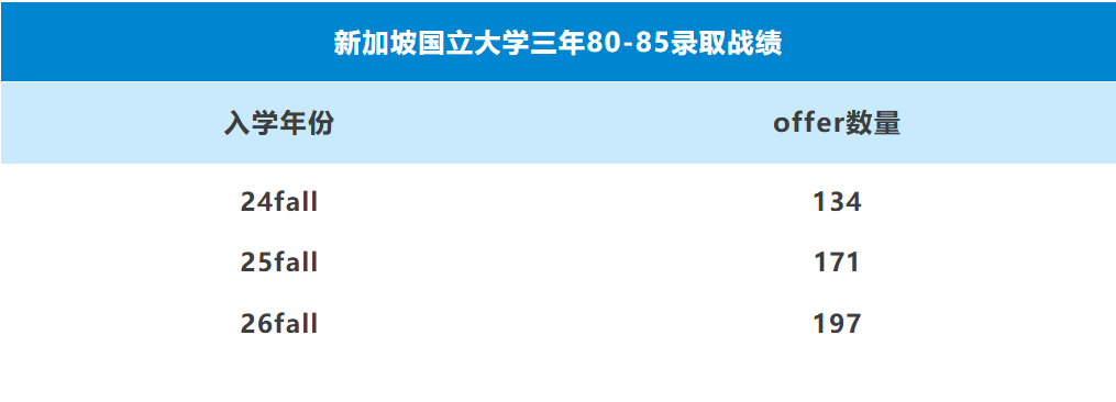指南君第一时间整理了近三年的录取案例,截至数据统计时(2026年4月8日),在24fall中,指南者留学共计收获134枚新加坡国立大学GPA80-85offer;在25fall中,指南者留学共计收获171枚新加坡国立大学GPA80-85offer;在26fall中,指南者留学共计收获197枚新加坡国立大学GPA80-85offer。