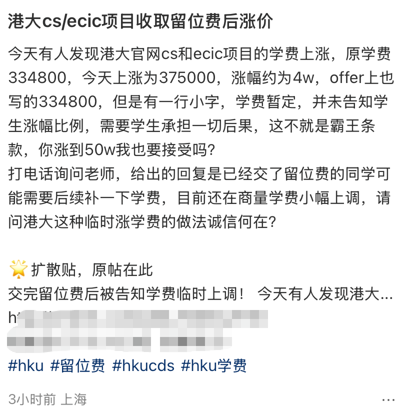 官网学费从33.48万港币悄然上调至37.5万港币,涨幅12%,净增4.02万港币。更令人窒息的是:大批学生已经缴纳了16万+港币的留位费,其他院校的offer已拒,全球硕士申请通道基本关闭。