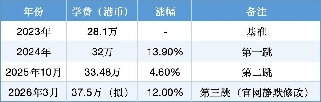 短短三年多,累计涨幅超过33%。从28.1万到37.5万,净增近9.4万港币。而同期香港CPI(综合消费物价指数)年均涨幅仅为2%左右(香港政府统计处数据)。学费涨幅远高于通胀水平。