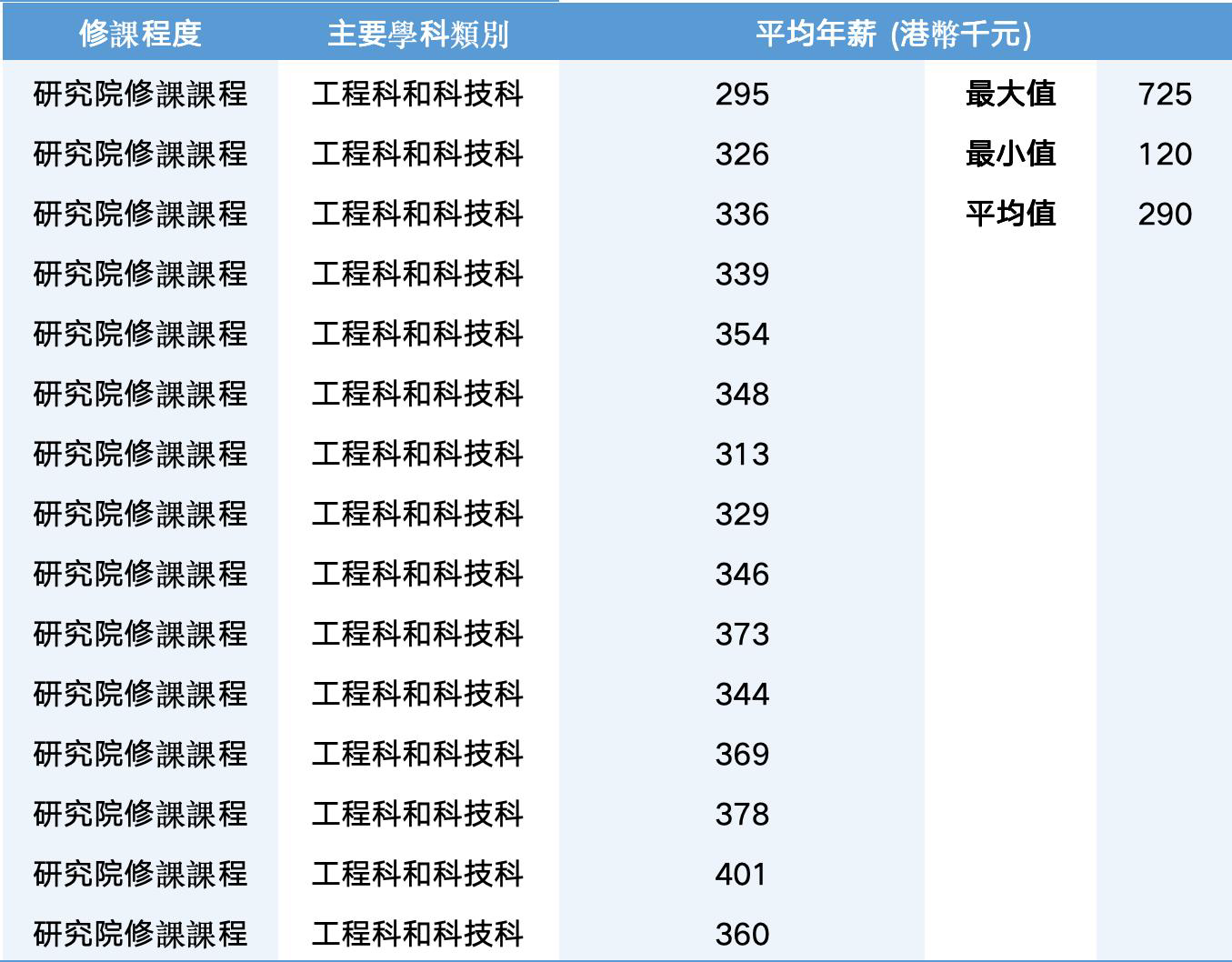 根据香港教育资助委员会(UGC)最新统计数据,香港授课型硕士中,“工程科和科技科”毕业生的平均年薪约为290千港元(即29万港元)。而计算机科学作为工程科技领域的热门方向,实际薪酬通常高于该学科平均水平。