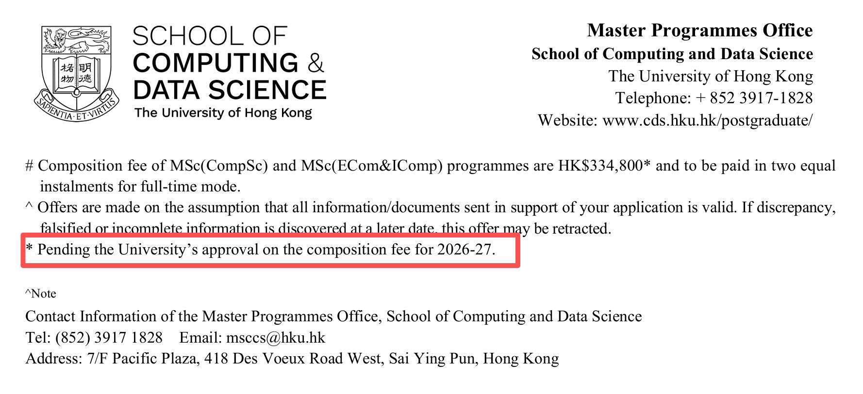 “Pending the University’s approval on the composition fee for 2026-27.”