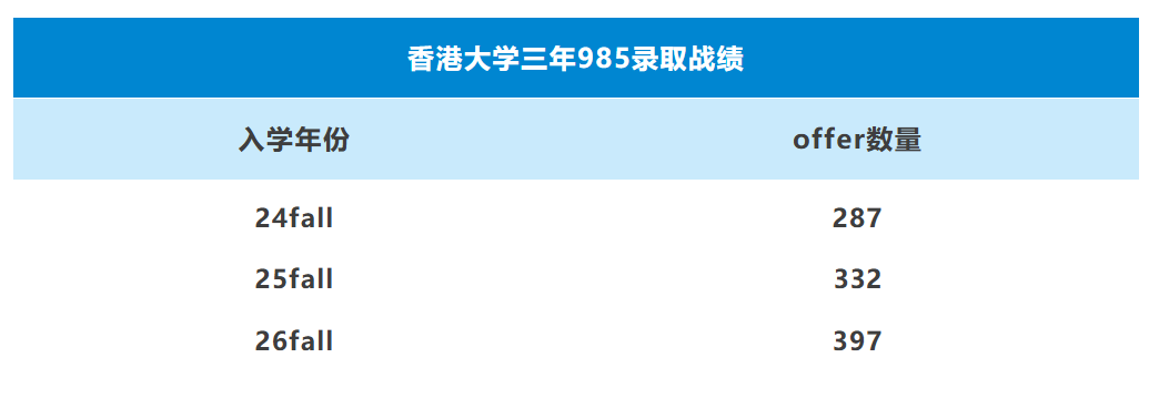 指南君第一时间整理了近三年的录取案例,截至数据统计时(2026年4月16日),在24fall中,指南者留学共计收获287枚香港大学985offer;在25fall中,指南者留学共计收获332枚香港大学985offer;在26fall中,指南者留学共计收获397枚香港大学985offer。