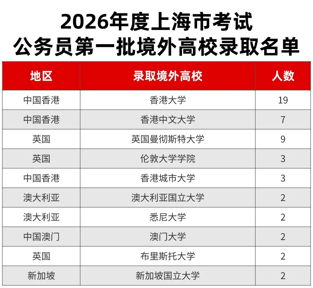 2026年度上海市考试录用公务员第一批拟录用名单公示,中国港澳地区以31人领跑,英国14人、澳大利亚4人、新加坡2人。香港大学录取19人,香港中文大学9人。一年制硕士回国考公考编受官方认可,港澳高校因地理位置和学制优势成为“香饽饽”。