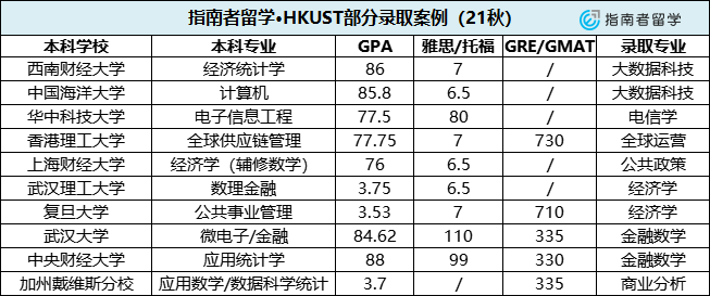 最后,指南君为大家整理了港科大21fall的部分录取案例,大家可以对照自己的实际情况比较一下和梦校录取要求之间的距离。如果想获得更精准的选校定位,可以联系指南者咨询~