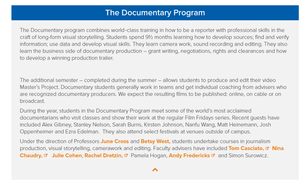 哥伦比亚新闻学院Columbia Journalism School M.S. program适合应届生申请(另有MA适合有工作经验的,注意不要申错了)。项目时长9½ months,提供2个specializations的选择,分别是The Stabile Investigative Program和The Documentary Program。