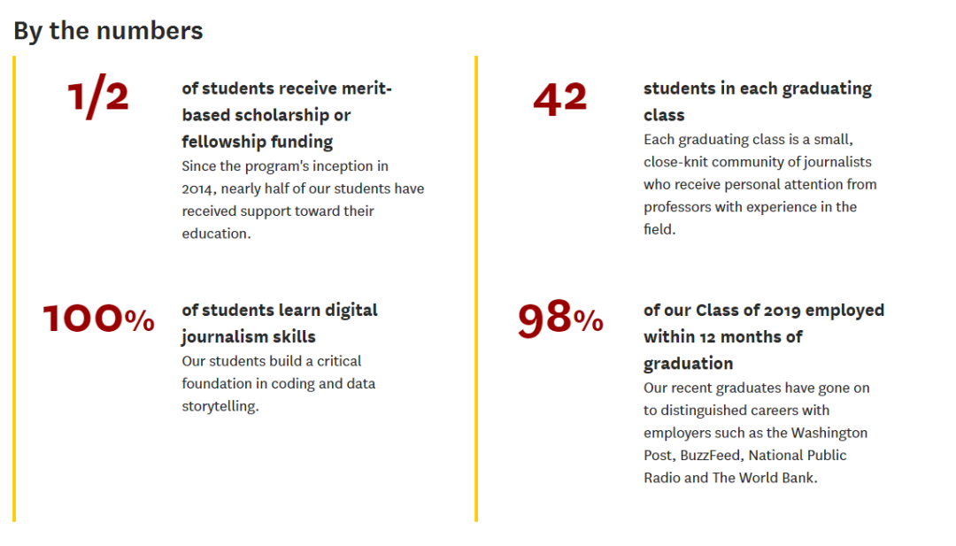 南加州大学 USC Annenberg新闻与传播学院可谓是每个传媒申请者的女神校,其下开设的新闻学 Master of Science in Journalism致力于持续推动新闻教育和实践,也是炙手可热的项目。