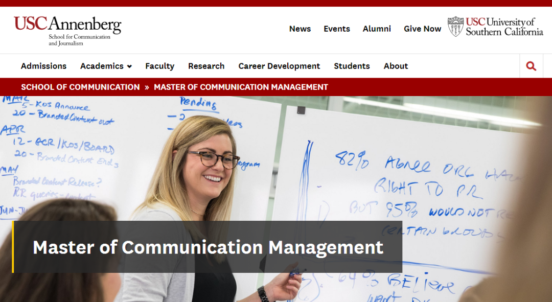 传播管理硕士是以学术为基础、就业为导向的应用型课程,共需32学分。课程可选方向比较多,Marketing Communication营销管理和Media & Entertainment Management媒体与娱乐管理都可,其他重点领域还包括:新传播技术New Communication Technologies、国际化与跨文化传播International & Intercultural Communication、组织与战略合作传播Organizational & Strategic Corporate Communication、健康与社会变化传播Health & Social Change Communication。课程整体还是比较软的,不建议想要走数据分析方向的同学申请(USC有个interdisciplinary的宝藏项目更合适,见结尾彩蛋)。