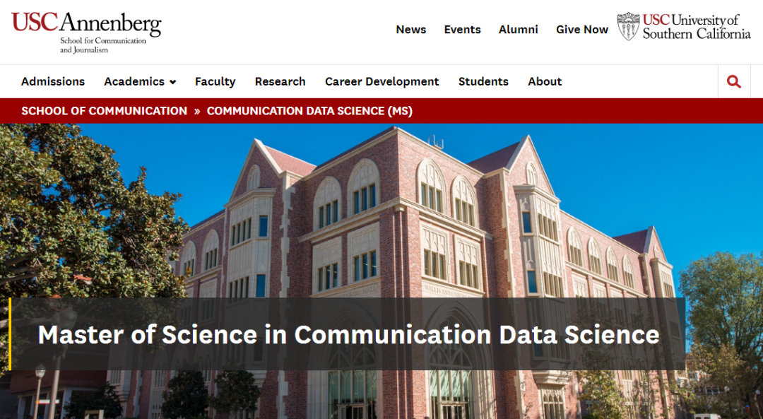 顺应当前大数据时代潮流,USC Viterbi工程学院和Annenberg传播和新闻学院联合创办的交叉学科研究生学位项目: The Master of Science in Communication Data Science。通过课程的学习,学生们将有能力结合传播领域专业知识以及数据分析的专业技能有效的管理团队,构建平台,分析和调研数字媒体平台产生的大数据。