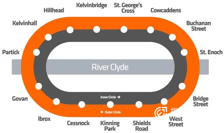 16. 格拉斯哥的地铁线是一条绕城的环形线,分为内环和外环,整个路程坐下来大概 45 分钟,全程经过 15 个站(在地铁开动前司机会把脑袋探出窗外看一看还有没有人要上地铁,也是蛮可爱的)。