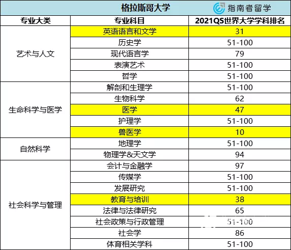 30. 在2021QS世界大学学科排名中,格大共有20个专业位列全球前100;其中兽医学位列全球前10,英语语言和文学位列第31,教育和培训位居第38。
