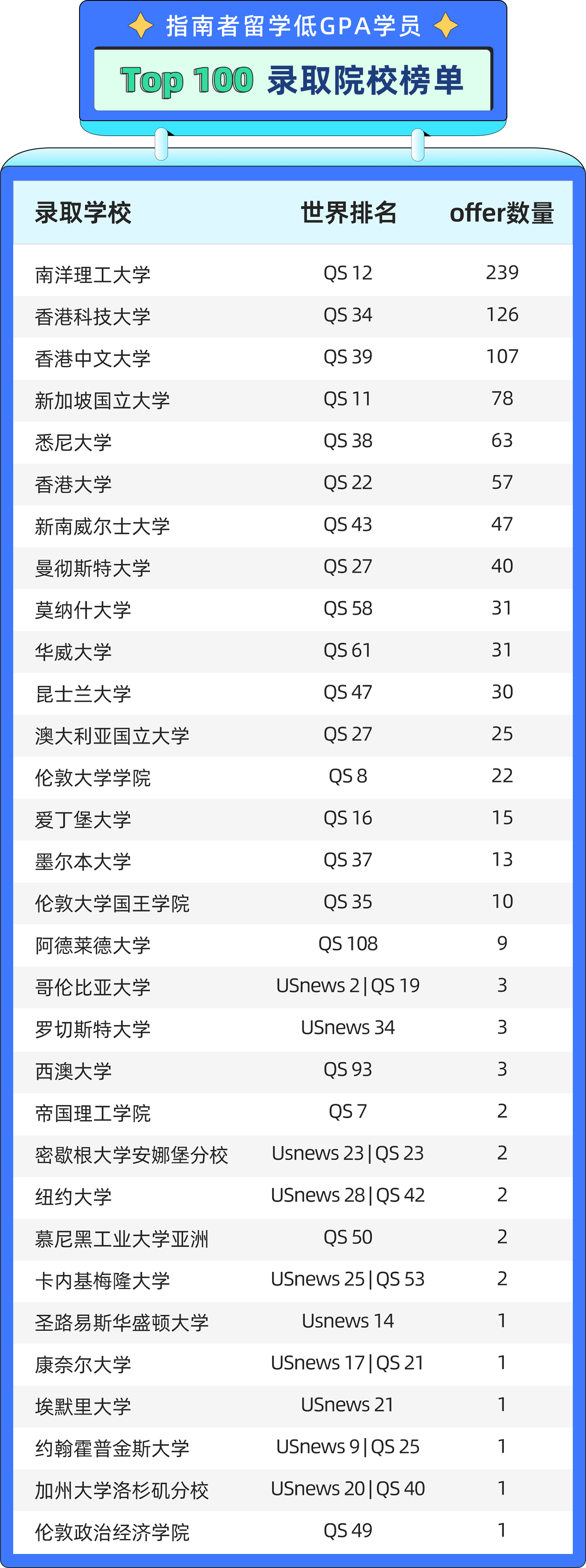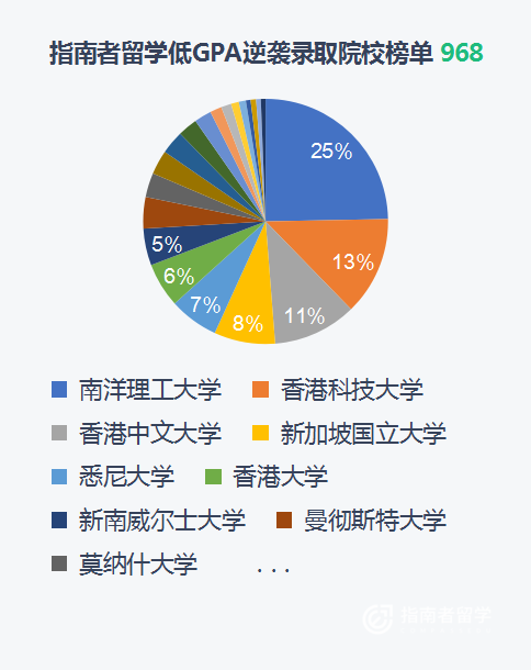 经统计,截至目前,指南者留学共计帮助554名低GPA学子成功斩获了美国常春藤、英国G5、港三新二、澳洲八大等在内968枚世界顶尖学府的offer。